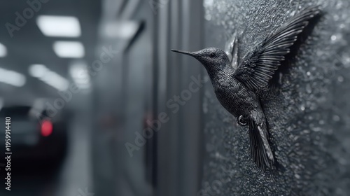 © Kristina, Obraz premium Hummingbird Sculpture in Gray Tunnel: Artistic Precision and Modernity