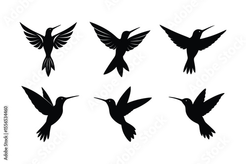 © Madhusudan, Obraz premium Hummingbird silhouette vector bundle illustration, Black Hummingbird silhouette vector
