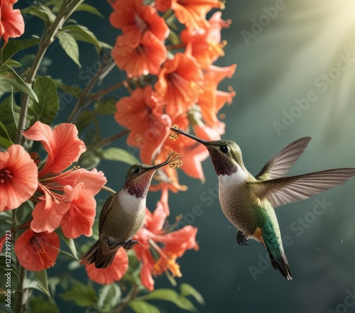 Naklejka premium Hummingbird sipping nectar from a trumpet-shaped flower in full bloom,...