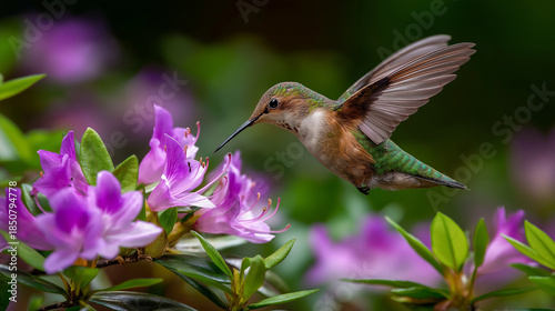 © Laura, Obraz premium Hummingbird sipping nectar from blossoms, scattered petals, gentle sunlight, serene nature photography, wildlife moment, spring scene, with copy space