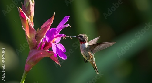 © Lucas, Naklejka premium Hummingbird sipping nectar from exotic vibrant flower in tropical garden under natural sunlight