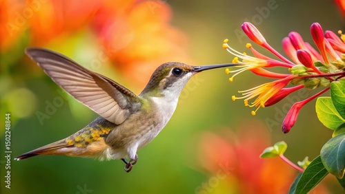 © udomsak, Fototapeta premium Hummingbird sipping nectar from honeysuckle flower, insect photography, hummingbird