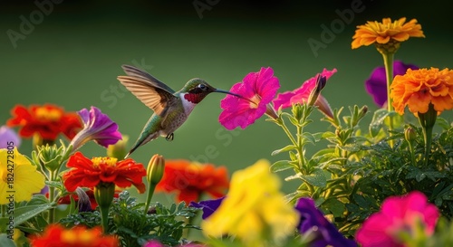 Obraz premium Hummingbird sips nectar from bright flowers, sunlit scene, blurred background