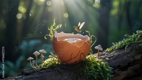 Fototapeta premium Hummingbird sips water from a cracked eggshell in sunlit forest