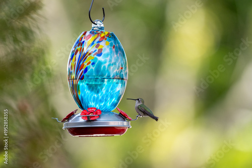 Fototapeta premium Hummingbird sitting on a colorful feeder