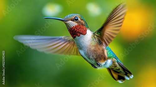 Fototapeta premium Hummingbird soaring in mid-air, wings fully extended, head angled to the side
