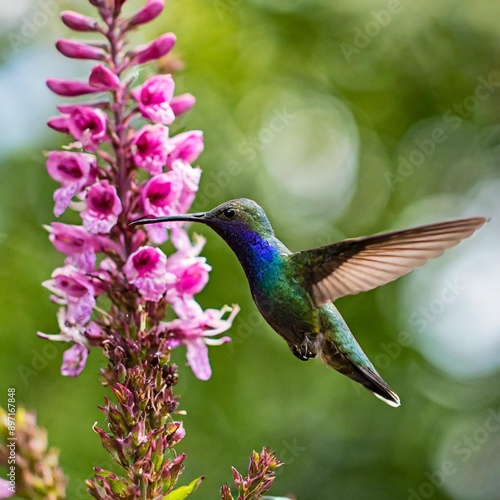 © Artbi, Obraz premium Hummingbird Violet Sabrewing flying next to beautiful pink flower