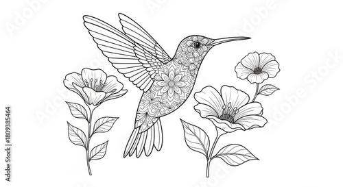 © Rifat's Arts, Obraz premium Hummingbird with floral patterns and flower illustration