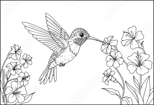 © Cici, Obraz premium Hummingbird with florals in monochromatic outline drawing style