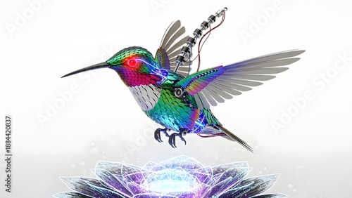 Obraz premium Hummingbird with iridescent feathers hovering over a glowing flower isolated on white background