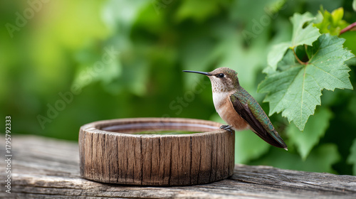 © Bonsales, Fototapeta premium Hummingbird with iridescent green feathers perching on a wooden bird bath, stopping for water against a blurred green background