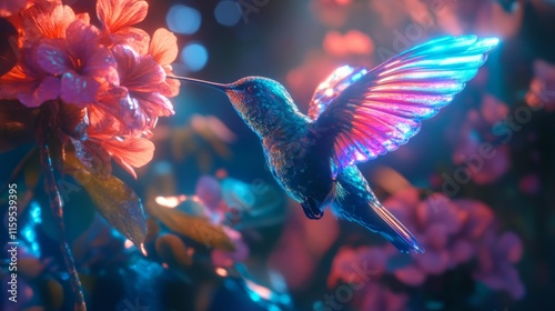 Fototapeta premium Hummingbird with iridescent wings hovering near neon flowers in a futuristic...