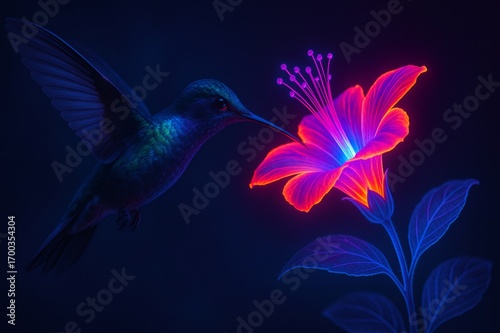 Fototapeta premium Hummingbird with shimmering, iridescent feathers hovering near a vibrant, glowing neon flower in a dark, enchanting environment