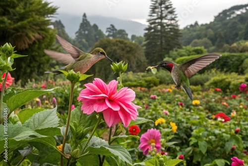 Naklejka premium Hummingbirds Feed on Flowers in a Garden During Morning Hours