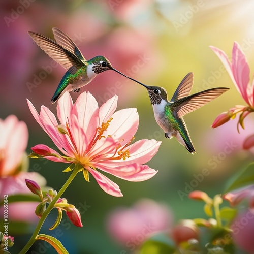 Fototapeta premium Hummingbirds in Harmony: Vibrant Flight Among Blossoms