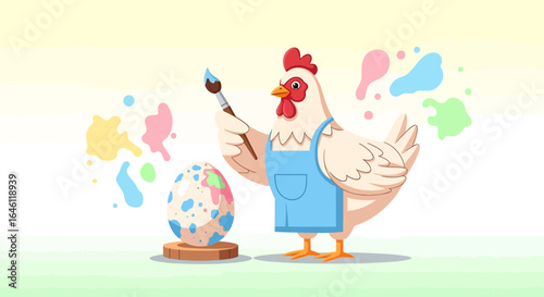 Naklejka premium Humorous Cartoon Chicken Decorating Easter Egg with Colorful Paints and Apron