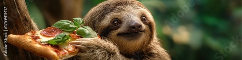 © Valentina, Obraz premium Humorous portrait: a smiling sloth holding a slice of pepperoni pizza