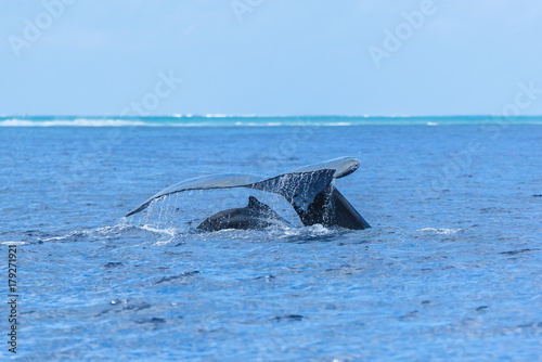 © Pascale Gueret, Fototapeta premium Humpback whale and calf in the Pacific Ocean, back of the calf and tail of the mother diving
