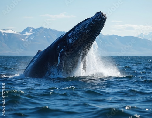 Fototapeta premium Humpback whale breach from ocean. Water splashes. Animal in natural environment. Iceland, Europe. Marine wildlife. Big whale, blue sea, mountains background. Nature scenery.