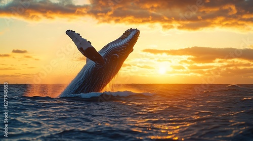 © HPMP Studio, Fototapeta premium Humpback Whale Breaching at Sunset with Dramatic Sky and Ocean Waves