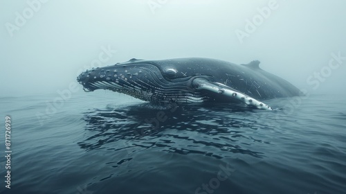 © FryArt, Naklejka premium Humpback whale breaching in foggy waters