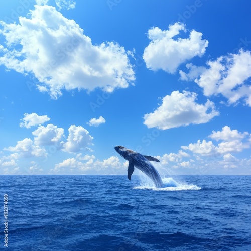 Fototapeta premium Humpback whale breaching in ocean under blue sky.