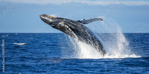 Fototapeta premium humpback whale breaching out of the deep blue ocean