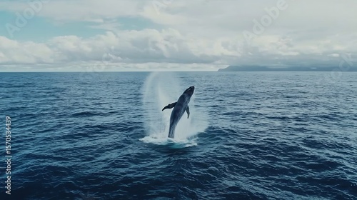 © alexsa, Fototapeta premium Humpback Whale Breaching Splendidly in Azure Waters Under Cloudy Skies