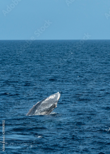 © Janos, Fototapeta premium Humpback Whale Calf practicing breaching in Tonga. Humpback Whales breach assumed to observe above water, possibly also to communicate.