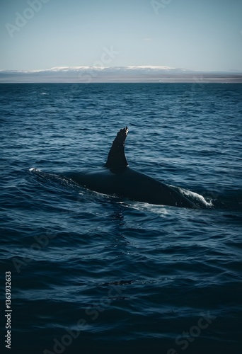 © Nanashi, Fototapeta premium Humpback Whale Dorsal Fin and Back in Ocean with Distant Mountains