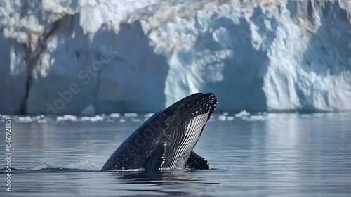 © AI, Fototapeta premium Humpback Whale Emerging from Arctic Ocean near Glacier