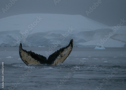 Fototapeta premium Humpback whale fluke with scars and barnacles showing at it dives. A mountain with a glacier is in the background. Photographed at dusk.