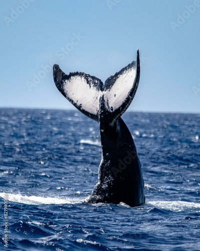 Fototapeta premium Humpback whale gliding through the tranquil blue ocean, with its tail fin...