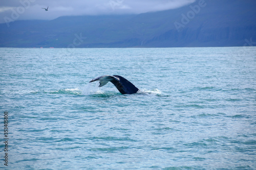 Fototapeta premium Humpback Whale in the blue ocean water. Whale tail in deep blue water. Global warming. Microplastic particles. Climate is changing. Iceland whale watching