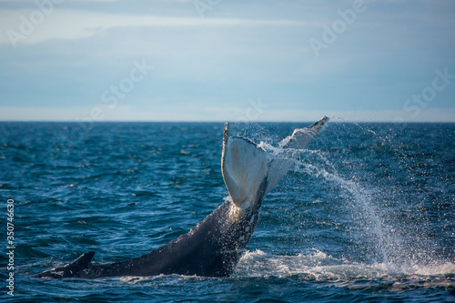 Fototapeta premium Humpback whale jumping out of the ocean water and splashing, Bay of Fundy, Atlantic Ocean