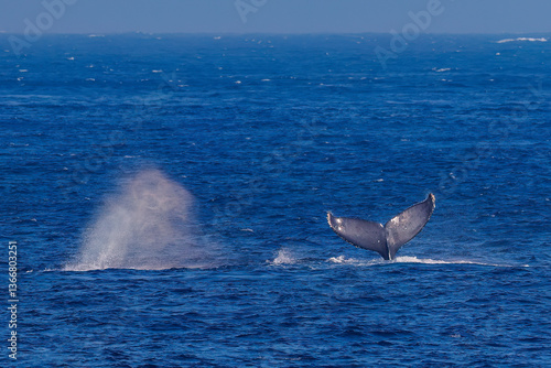 Fototapeta premium テイルスラップ(尻尾で海面を叩く)をしている。陸から見えたザトウクジラ(ナガスクジラ科)の群れが泳ぐ様子。 英名学名:Humpback Whale,...