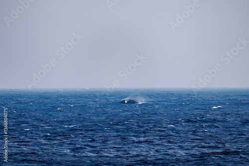Fototapeta premium ブリーチング(ジャンプ)をしている。陸から見えたザトウクジラ(ナガスクジラ科)の群れが泳ぐ様子。 英名学名:Humpback Whale,...