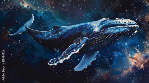 Fototapeta premium Humpback Whale Painting Space Swimming. Majestic contrasts against dark backdrop stars galaxies.
