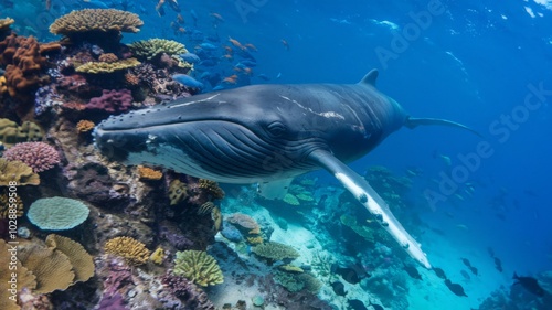 Obraz premium Humpback whale swimming among corals, underwater, marine life concept.