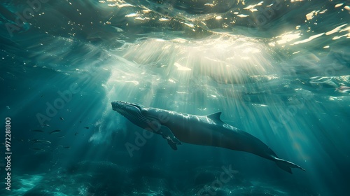 © Yelena, Fototapeta premium Humpback Whale Swimming Through Sunlit Ocean