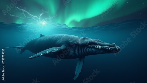 © Andry, Naklejka premium Humpback whale swimming under aurora borealis