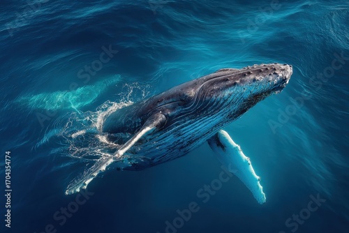 © MdAbulKalam, Naklejka premium Humpback whale with calf swimming near surface of deep blue pacific ocean, splashing and creating waves, aerial shot from drone in summer