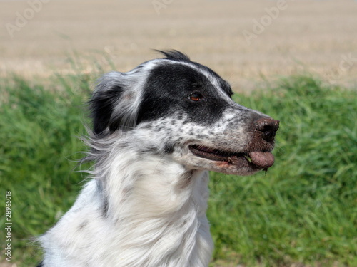 Fototapeta premium Hund mit Dreck an der Schnauze steckt die Zunge raus