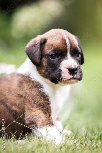 © Ines Hasenau, Obraz premium Hund niedlicher Boxer Welpen mit Maske draußen im Garten auf einer Wiese