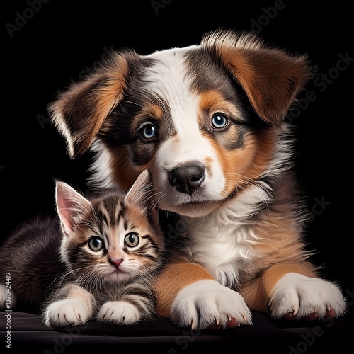 © Silvia Bogdanski, Obraz premium Hund und Kätzchen beim Chillen, schwarzer Hintergrund