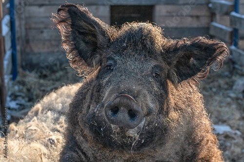 Fototapeta premium Hungarian breed curly haired mangalica pig portrait