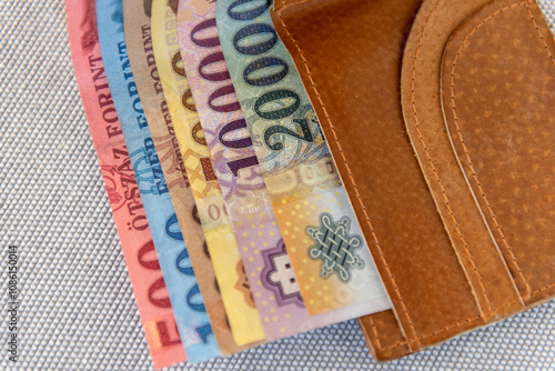 Obraz premium Hungarian forint banknotes in a brown leather wallet.