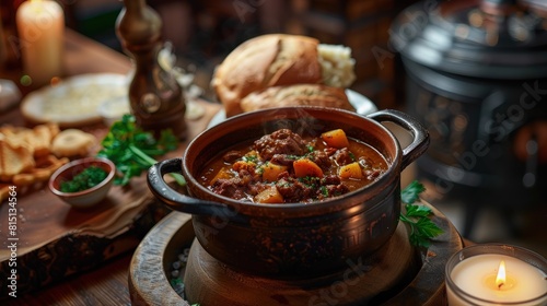 © Gefo, Fototapeta premium Hungarian goulash in a Budapest tavern, warm, inviting atmosphere, historic decor.