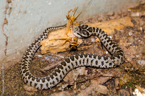 © belizar, Naklejka premium Hungarian meadow viper baby is eating a cricket