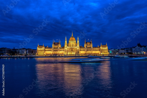 © jkraft5, Naklejka premium Hungarian Parliament and Danube River at Night
